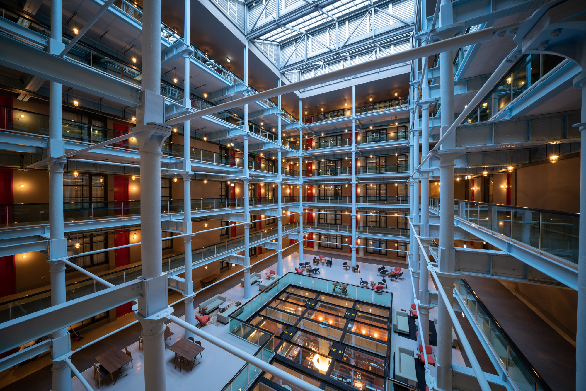 The industrial heritage of the building has been kept intact with the exposed iron girders and huge columns drawing your gaze to the ceilings where the natural light comes in and you can see the apartments stacked above. I plan to come back down once I’ve checked in and join what seems to be one of the coolest places to hang out in the city, but then I see my room…