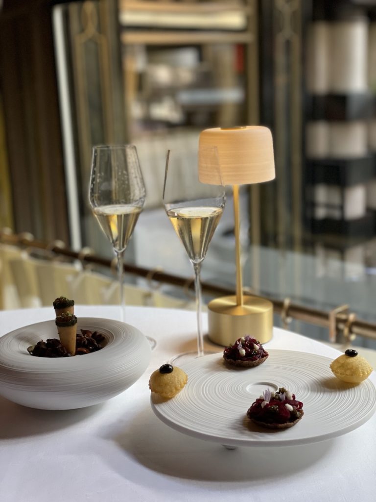Being such a small restaurant, Restaurant 1890 by Gordon Ramsay is tucked into one of the wings of The Savoy Hotel’s grand entrance and it’s not until you reach your seat that you realise there is a view over the bustling hotel guests and theatregoers outside. A quick cocktail in the bar perked us up for the challenge of a nine course tasting menu (Bespoke Black Book-style Espresso Martini, natch, with dark rum not vodka). The restaurant itself has a jewellery box aesthetic, with gold and bronze walls and ceiling, sumptuous fabrics and glassware on display. We were welcomed by Simone, who explained the menu to us and introduced Head Sommelier Emanuel, who is a considerable asset to this restaurant in his fascinating depth of knowledge and charming personality. Of course, his choice of aperitif for us, Taittinger Prelude Grand Cru NV, made an excellent first impression and we were similarly impressed by the canapés: the lobster cornetto, which was reminiscent of Mexican ceviche and tostadas, was my personal favourite.
