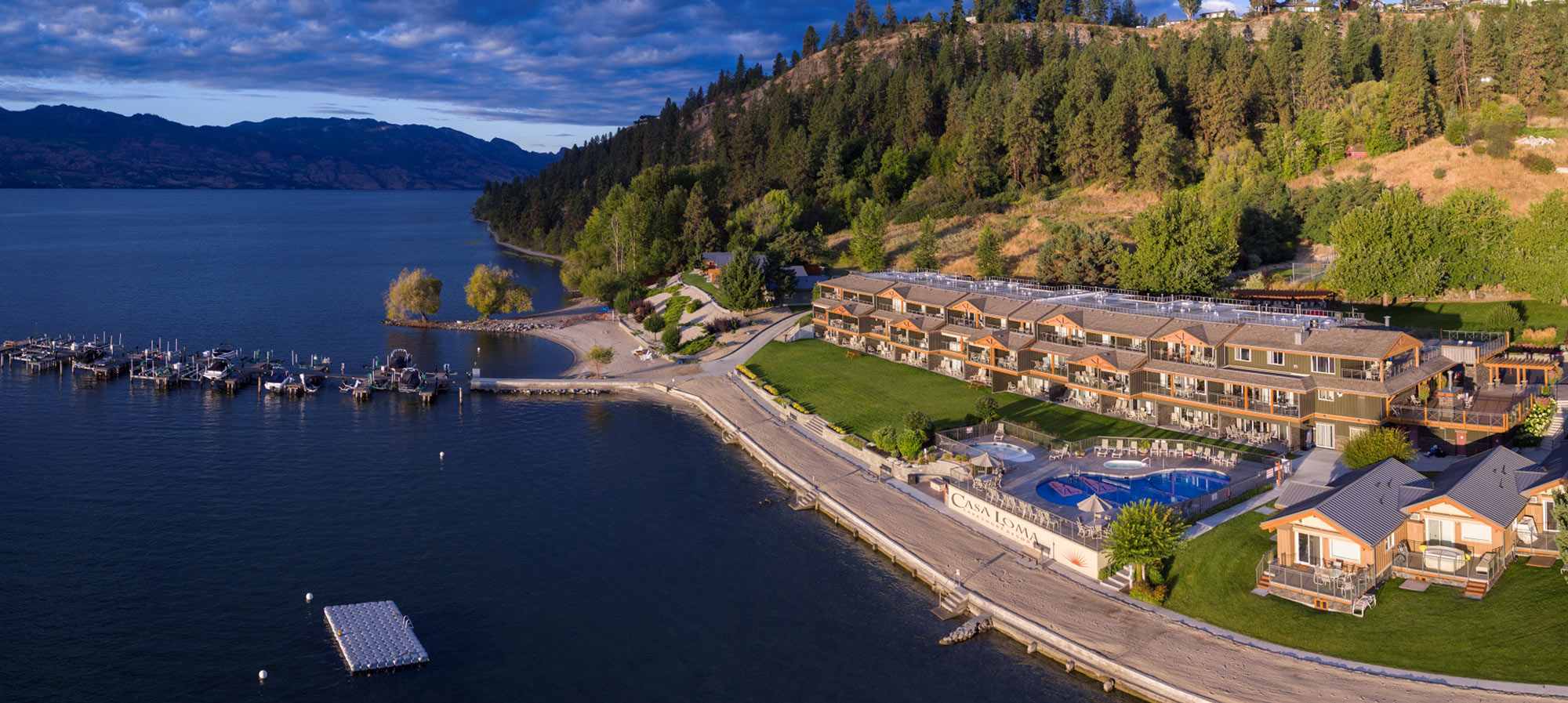 The two bedroom villas are 700 square feet of cottage-style living, and are located on the north and south side of the main condo building. Each cottage sleeps up to 6 people and range from single to triplex units, with waterfront walkouts. Depending on the size, some have one or two bathrooms, and all have patios.For food, whilst Casa Loma focuses on self-catering, there is an endless array of options for dining nearby. Aside from all the home-delivery food options, there is a Nesters market for groceries a short walk or drive away. For drinks, the options are world-class, with the renowned Quail’s Gate and Mission Hill wineries based just a 10 minute drive away. There are other wineries nearer too, though it is worth noting the exceptional panoramic lunch and dinner venues that both of these beautiful wineries offer. The Hatch, Beaumont Family Estate, Little Straw, Grizzli, and Rollingdale winery are all less than 10 minutes away. Wine lovers, rejoice.