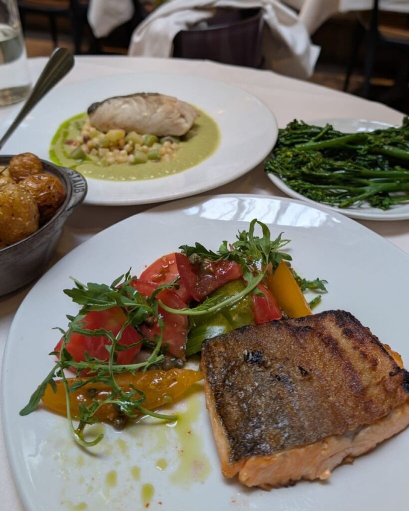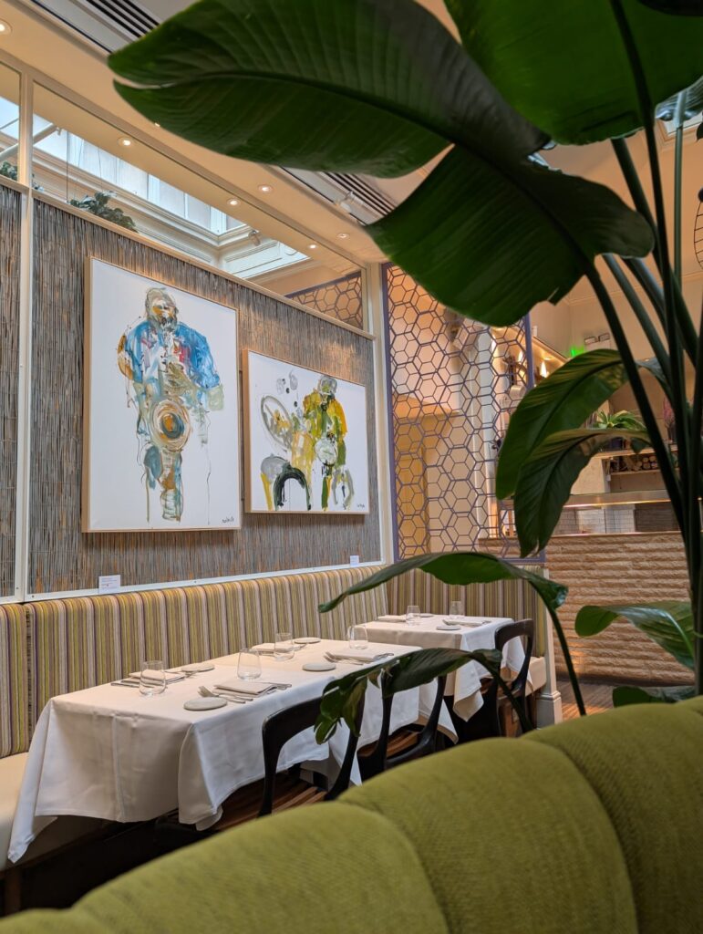 When we entered Cigalon, the place was brighter than expected – glass ceiling, double-height room, jazz playing smooth and low like it had nowhere else to be. Booths in green velvet curled around tables like parentheses, catching fragments of conversation. Light wood fittings with bamboo cladding the walls and plants as tall as an alibi. A jazz soundtrack slinked through the air, while paintings of jazz musicians hung along the walls, caught mid-gesture in colour and noise. Gina Southgate, apparently. She paints live at gigs, and her canvases were still vibrating, all brass and brushstrokes. I liked them.