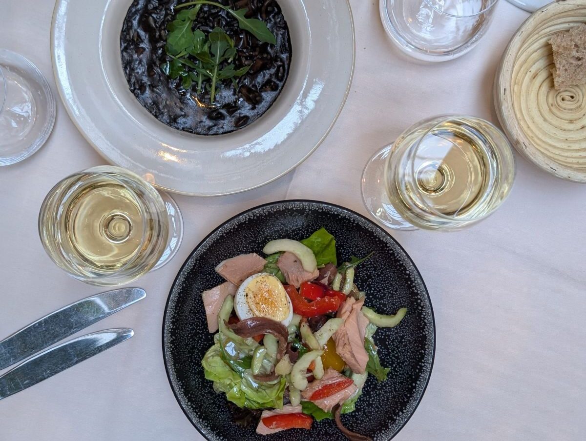 Sourdough, fougasse, and an olive tapenade that spread like butter arrived, with a bottle of 2022 Domaine de Triennes Les Auréliens Chardonnay. The wine was creamy, nutty, and tasted like someone very calm had a lot of fun making it under the warm French sun. As far as summer wines for French food go, this one was a winner.