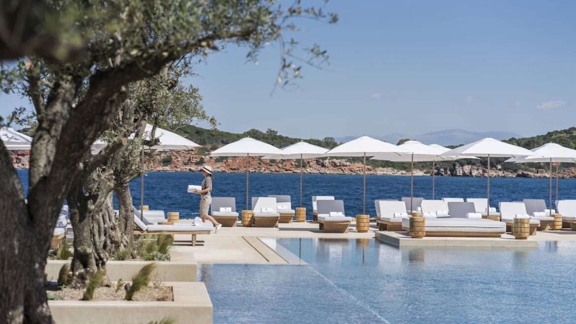 This ambience is further highlighted by the floating Olive grove in the main pool, flanked by cabanas clad in said organic cotton, perfectly complementing the Aegean Sea just steps beyond.