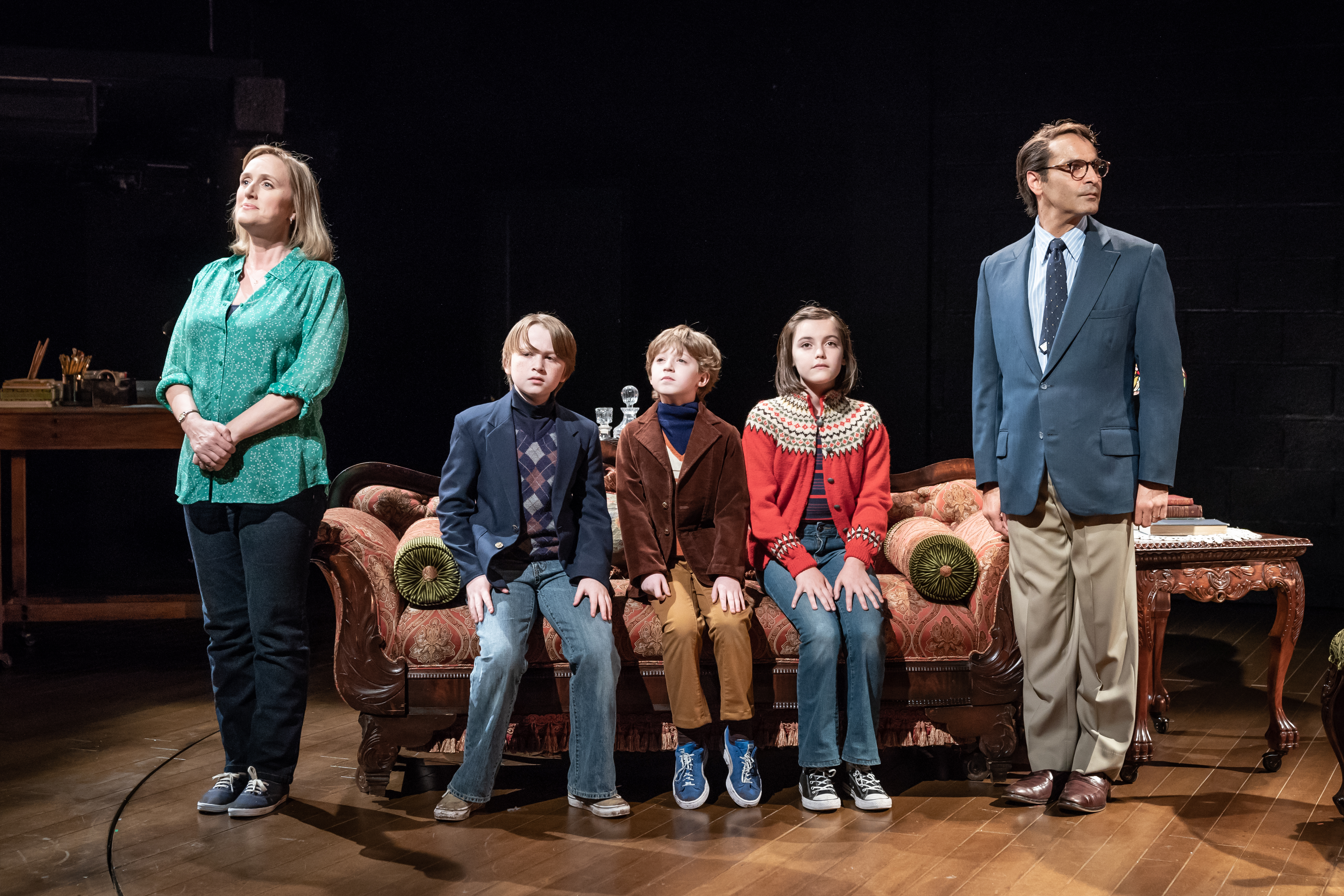 In David Zinn’s sophisticated design, from the early scenes in the polished grandeur of their historic house on Maple Avenue, which Bruce tends to like a museum and where his three children must fit in. To the bleak white wall that suggests both a bleak trip to New York and the disintegration of family life that gradually ensues. The design fits well in to The Young Vic’s wide stage with the band split between two balconies either side.There are some showstopping numbers, with Tesori’s music flexing and changing to suit the mood and meaning of Kron’s words. There’s a scene where Small Alison and her young brothers break into a Jackson Three routine around a coffin, another where psychedelic lighting (courtesy of Ben Stanton) transforms the stage into a Partridge Family parody, a sharp contrast with the reality Alison is now experiencing.