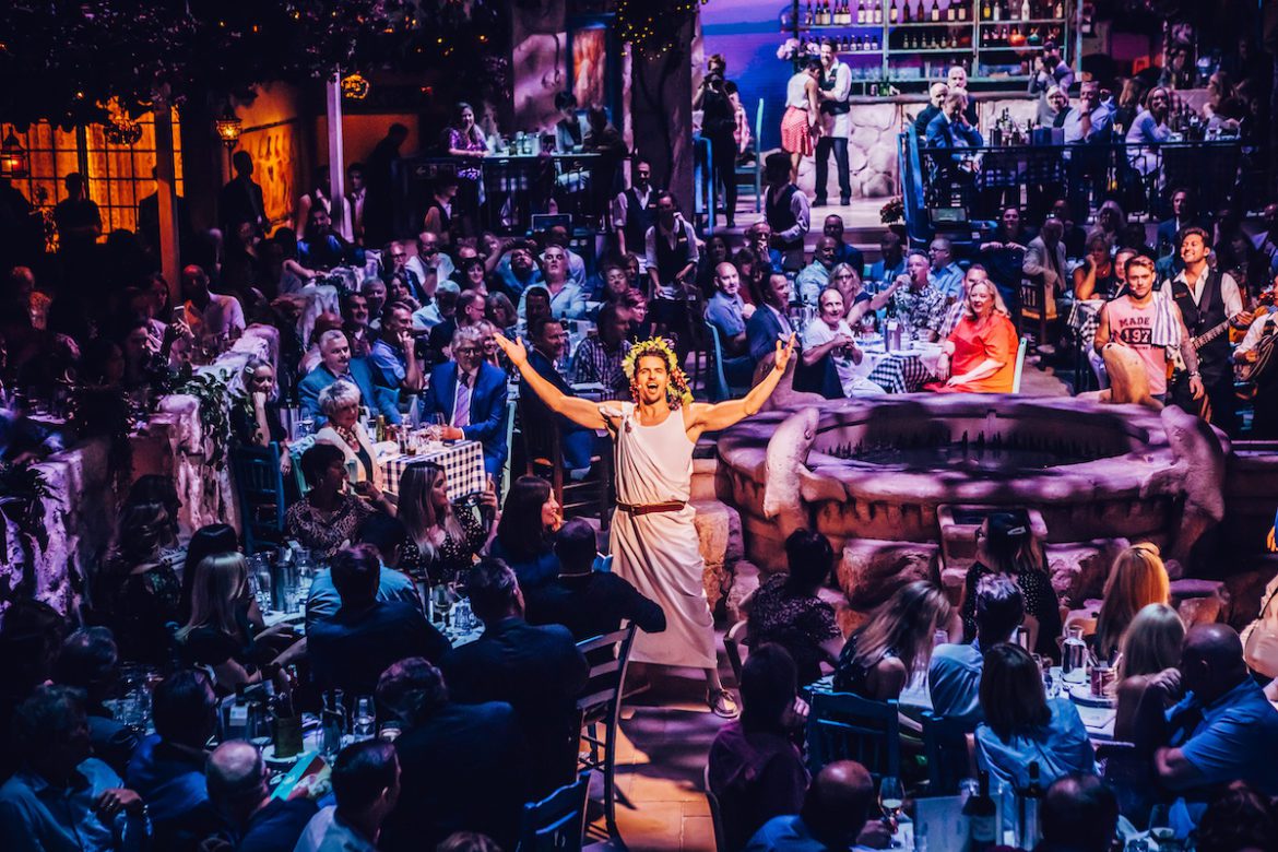 After a drink and a Mezze of bread (mix of focaccia and breadsticks), dips, and olives, the show starts in earnest. Nikos (Fed Zanni) welcomes us to his taverna (which seats over 500) and introduces his partner Kate (Tasha Sheridan), they tell us she did the costumes for Mamma Mia!, fell in love and never left.
