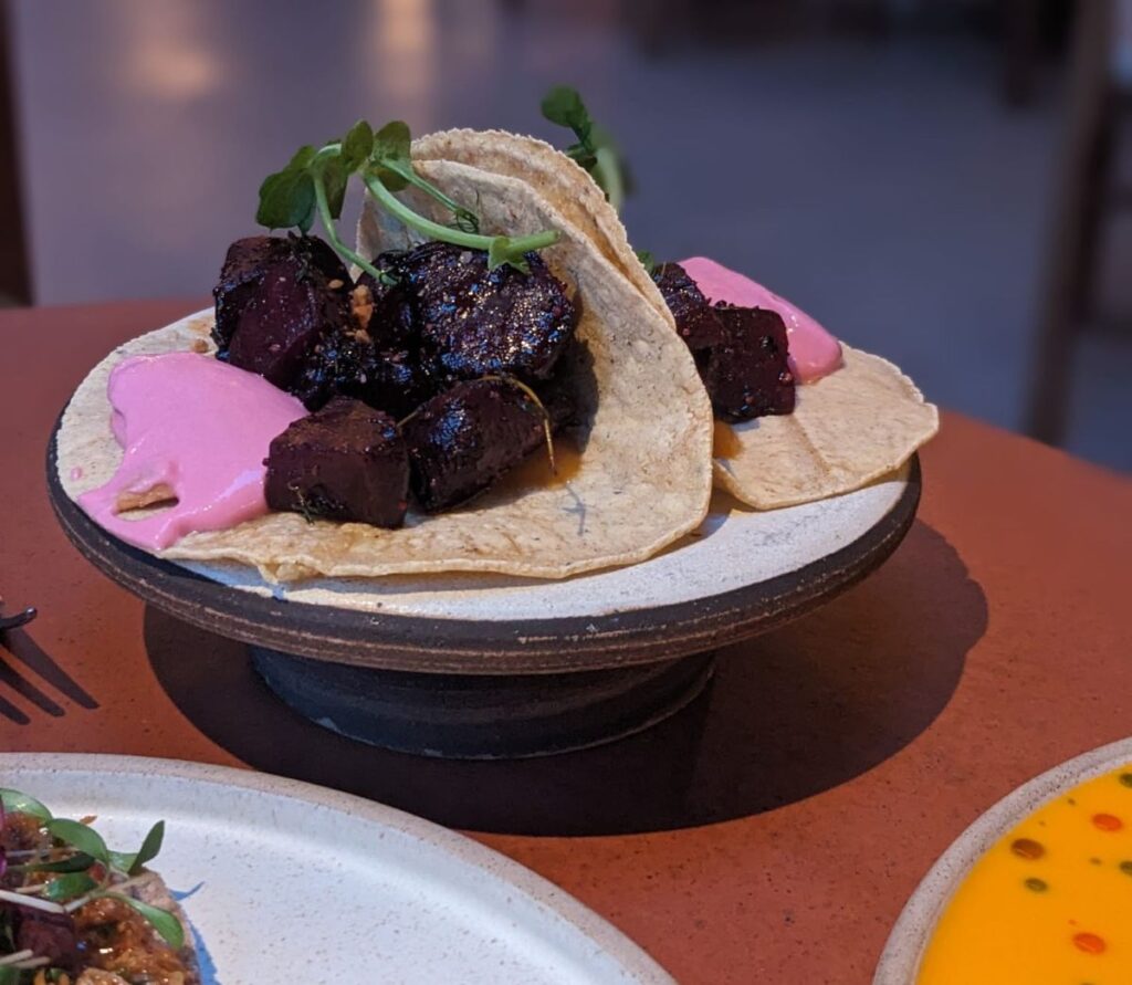 When it came to the food, Ixchel offers lots of tempting small plates, so we ordered a few of these to begin the dinner. First came the roasted beetroot taco, its jewel-toned body folded over a smear of jocoque and butternut squash purée, then topped with smoked almonds. The earthiness of the beet was beautifully lifted by the creamy tang of the dairy and the sweet-savoury hit of squash – all anchored by those smoky, crunchy nuts that added a welcome contrast. A quiet plate, but one that lingered.