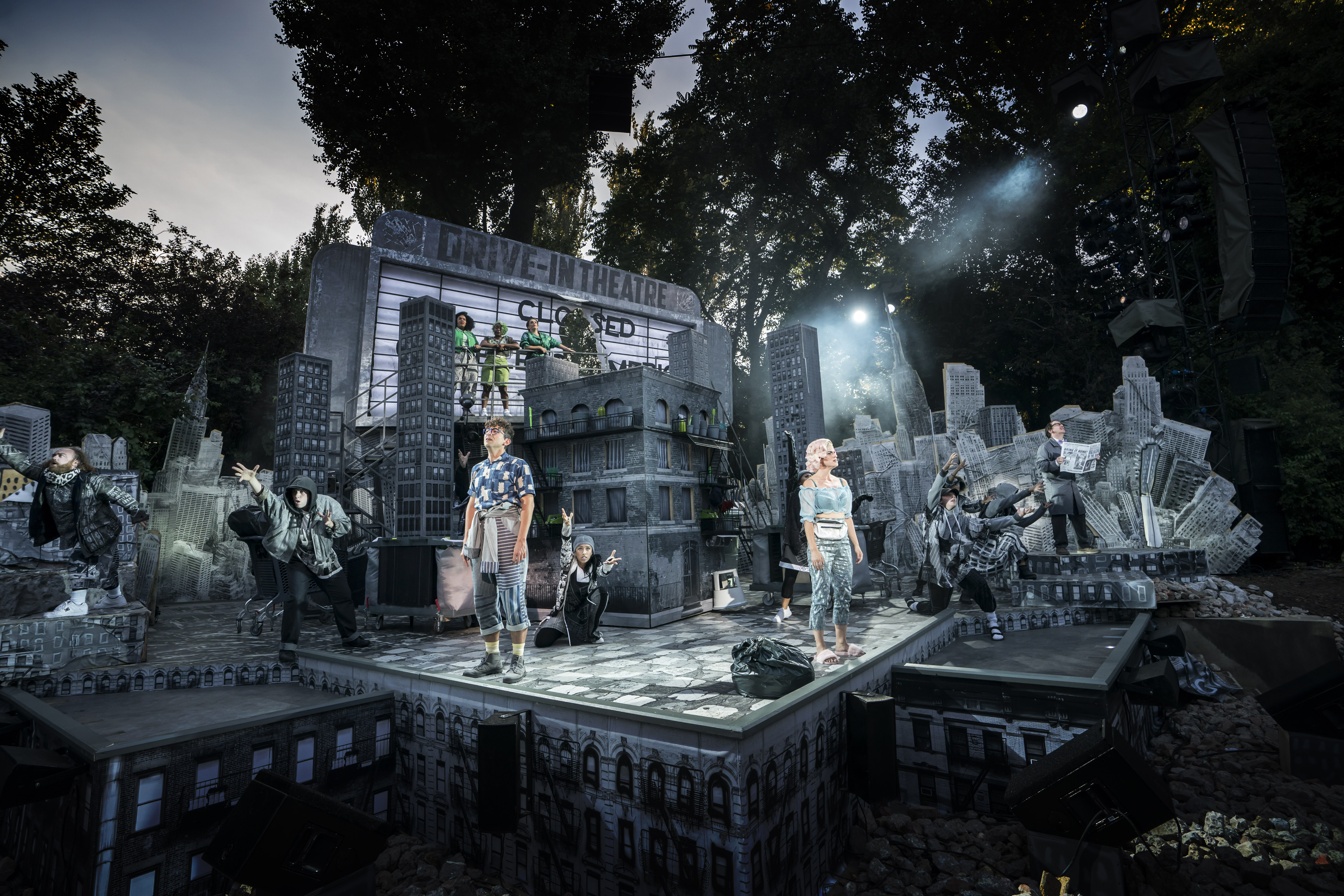 The man-eating extra-terrestrial plant – named Audrey II after the co-worker whom Seymour, the sweet-natured florist, pines for – is usually evoked by means of outsize puppetry and an offstage voice. Here, though, when it grows to the point where it starts to hanker after world domination, this outlandish creature is played by the divine American drag queen, Vicky Vox. It’s an inspired piece of casting. Prowling around in fishnets and skin-tight green spandex and growling out orders to “Feed me!” from glitter-encrusted lips, Vox is in complete, voluptuous command. It was a clever choice to make Audrey II a person rather than a puppet and Vox nails the character, a real highlight.Tom Scutt’s impressive design has a monochrome, graphic-book feel in its depiction of crumbling tower blocks, surrounded by rubble, with the down-and-out denizens of Skid Row pushing round model versions of these tenement buildings in shopping trolleys. The set is surmounted by a shattered drive-in cinema marquee, a nod both to the destitution of the neighbourhood and to this musical’s B-movie origins. The choreography by Lizzi Gee is stunning from the word go with sharp and precise moves.