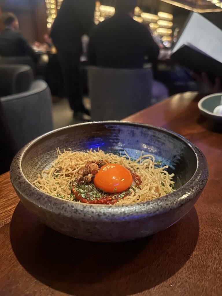 Next, we were presented with the tuna tartare, artfully arranged with a raw egg perched atop. The server skillfully mixed the egg into the tartare at our table, revealing a base of crispy wontons. The tuna was meaty yet delicate, seasoned beautifully with a hint of soy, making it a perfect starter.