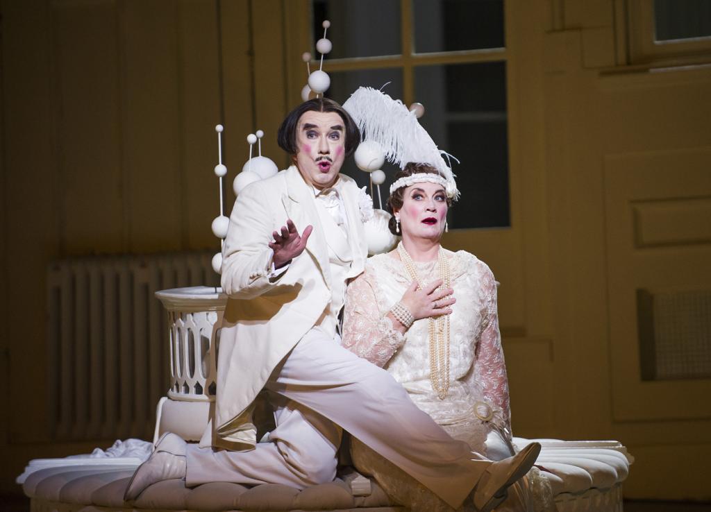 Offshoots of the main stage give room for much amusing business with maids running in and out and a bell hop climbing precariously on to a mantelpiece to water a pure white plant with a pure white watering can. The costumes of Sue Blane follow this theme with everyone in black and white and grey brightened only by little touches such as the men’s button holes and the girls’ wigs. The Mikado himself takes a relatively small part in the story and in his 20th century costume is made to look so comic it is hard to take him seriously as the feared overlord of the people in his fat suit, but this is all intentional to the humorous storyline.This revival production is directed by Elaine Tyler-Hall who started her career as a dancer and then worked as a dance teacher, choreographer and Benesh Movement notator, as well as assisting choreographers and directors on dance and opera productions.  Tyler-Hall has worked on revivals of productions including The Cunning Little Vixen, Orpheus and Eurydice, The Fairy Queen, Rigoletto and Tosca in London, as well as travelling with Orpheus and Eurydice to New York City Opera.