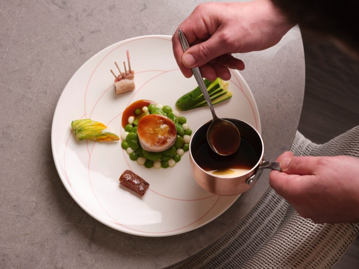 The wild turbot, served with a crispy mussel, broad bean, fennel and Riesling was inspired by Michel Roux. This light, fresh dish was a complete contrast to the dish that followed: a tender round of salt lamb saddle, with hearty vegetables like aubergine, courgette and artichoke, with a basil lamb jus. There was a depth to the sauce that was very impressive, once again perfectly matched with the wine, on this occasion a Saint-Joseph Syrah 2021 from Laurent Habrard which was fruity, juicy and peppery all at once.