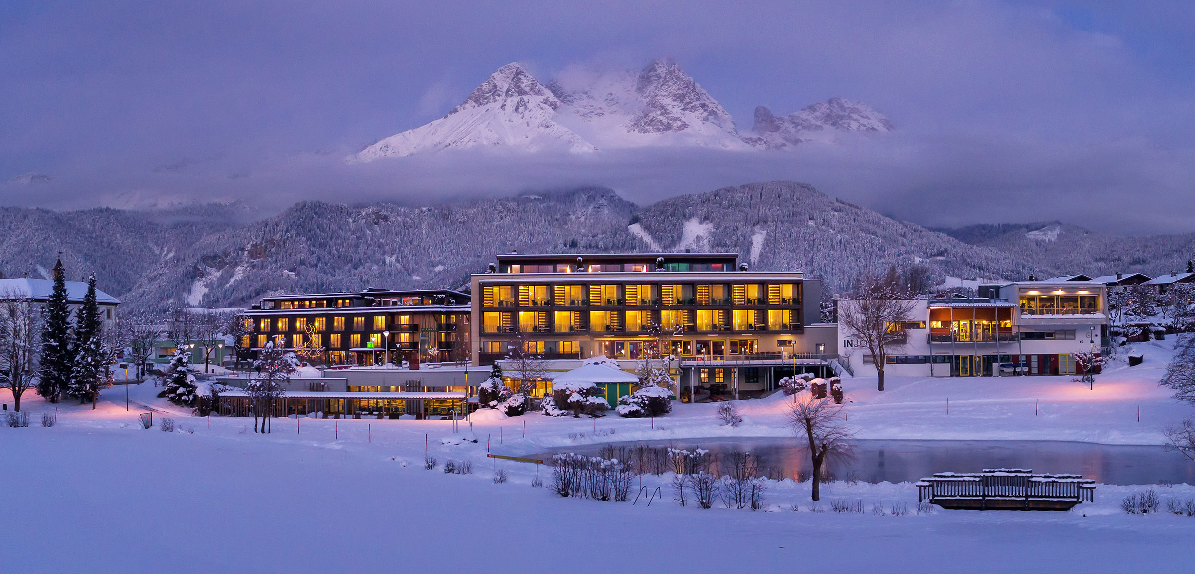 Think of ski accommodation and most people will picture chalets or grand palace hotels positioned in the bustling hearts of a ski resort. We were off to try something a little different on the outskirts of Saalfelden in Austria. Now Saalfelden is not a ski resort itself but rather a very well positioned town within a stone’s throw of several great ski resorts that I particularly like, so when we were invited to stay at the 4 Star Superior Ritzenhof hotel & Spa am see it did not take long to make the decision to go. The Hotel is positioned on the quiet outskirts of Saalfelden right on beautiful Lake Ritzen with stunning panoramic views of the surrounding mountains of which there are many. The hotel was first opened in 1980 and is now in the hands of the second generation of the family Riedlsperger. Over time the hotel has evolved, expanded and been refurbished to its current state 60 well appointed contemporary Alpine style rooms and 12 Family rooms as well. Spacious and modern with traditional materials alongside modern design features such as the tall Swiss pine humidifiers to deal with the dry Alpine air, the rooms have been well thought out. We had arrived in early January 2019 when snow storms had been battering Austria, so arriving at the hotel was spectacular with so much snow laden all around giving what was already a peaceful and quiet area an even greater atmosphere of solitude. With perfect timing we arrived just in time to afternoon tea and cake, of course we had to fatten up to make sure that we would keep warm in this weather. Several slices of cake later, once we had scrubbed up and were suited and booted it was time to experience dinner, Ritzenhof style. Chef Olivier van den Beek heads up the kitchen, his menu is defined by regional, seasonal produce with modern, creative twists on classic Austrian cuisine. Olivier likes to use the freshest of ingredients from farmers in the Saalfelden Leogang region, so the carbon footprint is very small. The Ritzenhof garden supplies the herbs, the meat comes from a local Organic farm, the fish from Leogang, even the honey comes from beekeepers in Saalfelden. The cheese and schnapps literally comes direct from next door! If it is not fresh from the field or lake then it has probably been cured in the hotel’s smoke-house. The Organic wine selection tends to be from Austrian vineyards too. Chef Olivier is also a dab hand at creating vegan menus for guests.We settled into our seats in the contemporary yet very welcoming restaurant; no sooner had we sat down then there was a glass of Niki Windisch Blanc de Blancs in our hands. First up was Yellow paprika cream soup with hickory foam, the smokey flavour was delectable with hints of hot spicy Spanish paprika; wholesome and warming- perfect to counteract the storms outside. The next plate was Vitello Tonnato with capers and corn salad beetroot with apple tartare, horseradish and almonds served with a Nigl Grüner Veltliner wine, smooth and sweet next to the salty capers and delicate veal. For the main course we opted for one Sea Bass filet with ratatouille vegetables and white bean cream and one Tortellini filled with pumpkin pesto and nut butter; the Sea Bass had a spicy yet clean flavour to it whilst the tortellini was homely, natural and beautifully buttery in texture, these were served with a Blaufränkisch Ried Hochäcker. Dessert was a beautifully presented delicate Ganache balls with lemon ice cream and coco. Wholesome and natural is the theme here, the food is local and seasonal and somehow this comes through in the delicious flavours and textures.The Rizenhof spa and wellness centre, is certainly worth experiencing too. With various saunas, steam room, infra-red rooms and relaxation area I was in my element. I love the extremes of cold and heat, so loved the idea that one can walk out of the sauna barefoot straight into the snow and stand around the log fire; from here one can then venture through the snow to the langlauf tracks and walk barefoot beside the frozen lake Rtizen, where one can apparently ice skate if there is not too much snow. In the summer, one can access the lake and private beach for some wild swimming too. Due to the Ritzenhof’s position, there are 140km of cross country trails directly accessible from the hotel ,other winter activities include various toboggan runs, horse-drawn sleigh rides and guided snowshoeing. For skiers like myself the hotel is only 7 minutes from Maria Alm/Hochkönig (Free Shuttle Bus), a 15 minute car journey from Zell am See and Leogang (Free Shuttle Bus) and 35 minutes from glacier skiing in Kaprun and a day in Salzburg is only 1 hour away. The Ritzenhof hotel und spa am see is a perfectly positioned hotel, away from the madness that can sometimes surround ski resorts, the panoramic views of the surrounding valleys and mountains are spectacular, promoting a slower pace for the mind and body. The hotel has left such an impression on me that I would really love to go back and see the lake and surrounding valley in summer, which I am sure will be just as stunning.