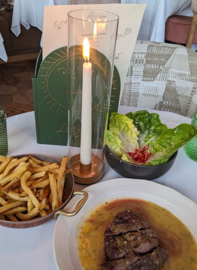 Then came the main event: a fillet steak with café de paris butter, served alongside rough-cut skinny fries and a salad strewn with more Parmesan (because if there’s ever a time to overdo the cheese, it’s at Riviera). The steak was exactly what you’d hope for – seared and succulent – while the butter melted into a velvety, herby sauce with whispers of mustard and anchovy. The fries had crunch, as a good fry ought. The red wine – a Saumur Rouge, La Cabriole, from the Loire – was light enough to cut through the butter but structured enough to stand up to the beef. It’s a classic pairing done with elegance and style, and it worked.