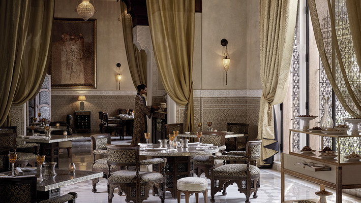 Every dish is a presented like a work of art, so dainty one wonders how to approach such a dish as it seemed a shame to spoil such a splendid food. The langoustine was perfectly pink and succulent, the sea bass flaked under your fork and complemented the al dente pasta; the pigeon was meaty, earthy, and very easy to eat as it had been boned. Not a usual lover of desserts since I am such a carnivore, I surprised myself that I was mesmerised by the chocolate shell, the portion was just right so it was not too sickly or heavy after such a meal, I could have probably – to my shame – eaten another one! In such a beautiful dining room I could have easily whiled away the hours there taking in the ambience of such a grand restaurant but Royal Mansour has so much to offer in the way of food and beverage one can eat and drink at a different place each night if you so wish.