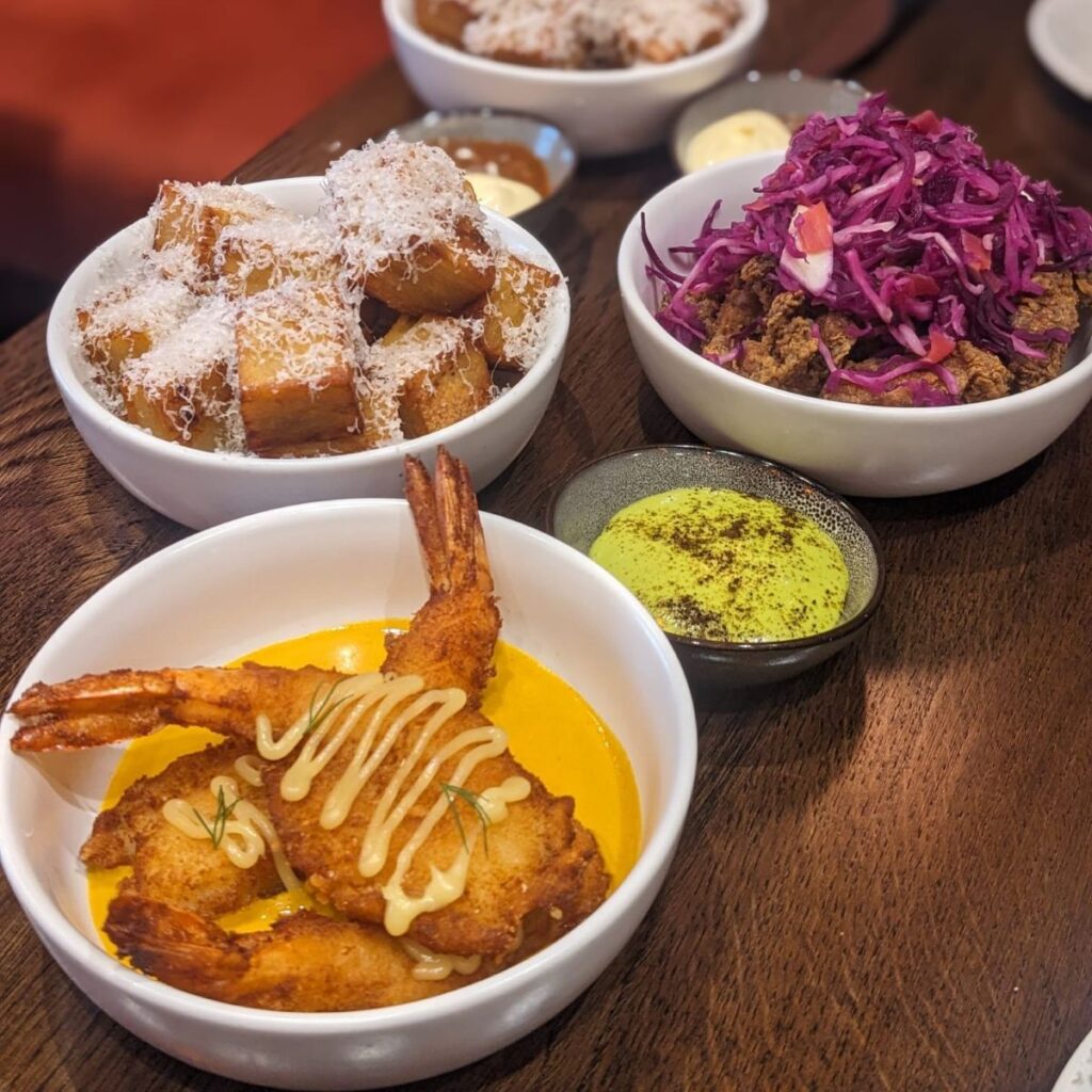 Next came the jerk chicken – not a chargrilled and sauce-slathered bird, but breaded thigh pieces in a spiced coating. Instead of Scotch bonnet heat, there was a tangy green sauce with tamarind and a crunchy garnish of red cabbage. The prawns, too, had their own surprise: fried and resting in a silky, earthy yellow sauce made with egusi (squash seeds), and punctuated with sharp drizzle of lemon gel.