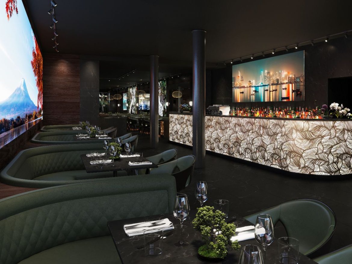 After getting to my table I immediately want to get back up and walk around to take everything in; the artwork, digital projections, the endless bottles of spirits on the bar, bespoke Italian furniture, and bespoke Geisha wall designs, the chefs preparing food and the subtle, soft mood lighting brings everything together in a chic, intimate way. It’s wonderful.