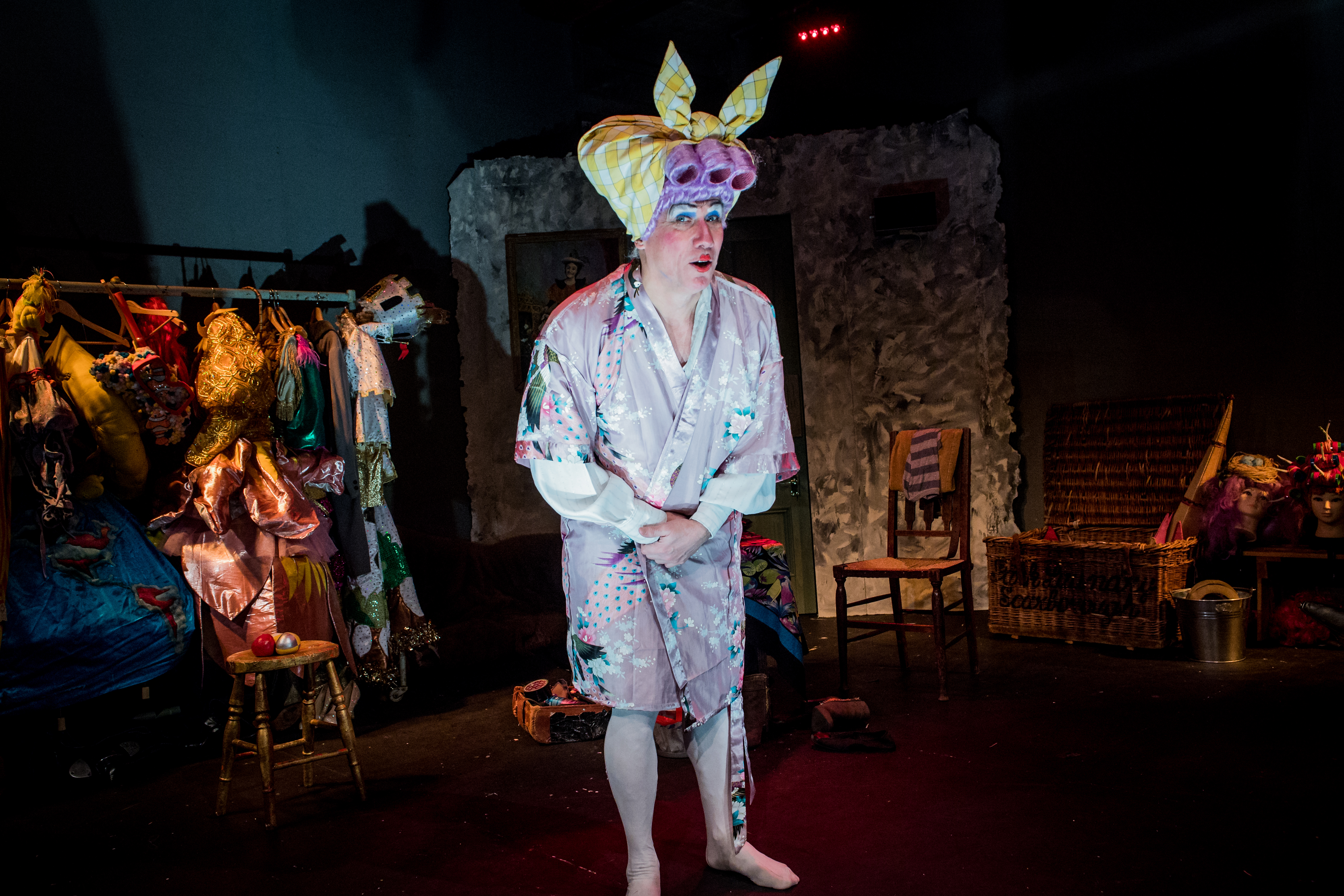 Playing Ronald Roy Humphrey, an ageing comic, the story which unfolds is far from a farcical, tongue in cheek representation of life in drag; But chronicles heart-wrenching memoirs, of a sad, lonely man, who is driven by being centre of attention on stage. But there is a fragile creature beneath the makeup who references music hall greats including George Robey and Dan Leno. (Look them up to see his standards!)Slipping between characters – Punch and Judy, Widow Tanky even Charlie Chaplin, the real Ronald is seen when he doesn’t have his costume to hide behind.
