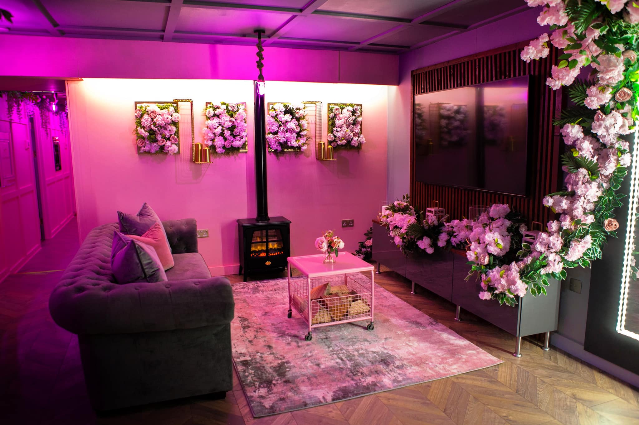 The Copper & Blossom Suite sleeps 8 people and is home to a spacious lounge and kitchen, 3 bedrooms and a private cinema room complete with popcorn machine. There is also a separate bathroom with a waterfall shower a bar area and a fireplace to keep the whole room toasty and warm. The flower theme carries on into this suite but on an even larger scale, you’ll also find a Christmas tree in the living room to give you all the festive feels!